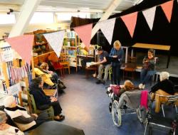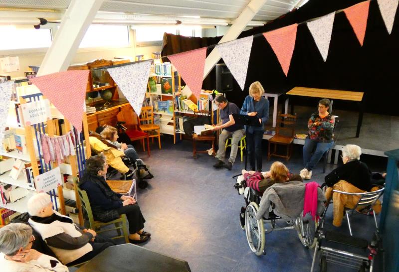 Les résidents ont été accueillis par les lecteurs Catherine, Martine et Bernard au "Bidule", café associatif du village. Très attentifs aux lectures à voix haute, les résidents ont apprécié la sélection de contes du Moyen Âge et de paroles de chansons proposée ce jour.