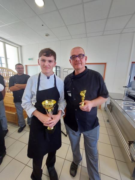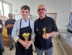 Le thème cette année étant plat végétarien avec le boulgour comme ingrédient imposé, Christophe et Noé ont présenté un "Houmousse fruité" et une "Trilogie végétarienne". Christophe a offert en guise de remerciement la plus grosse des coupes à son apprenti. Félicitations à tous les deux.