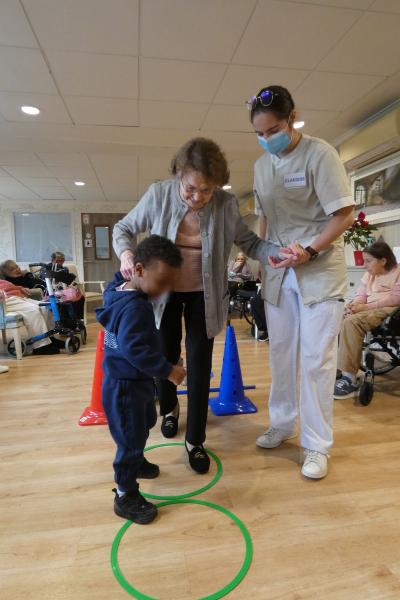 Les échanges intergénérationnels sont toujours très attendus par les résidents. C'est autour d'un atelier de motricité que les enfants de la Maison des assistantes maternelles et les résidents ont pu partager entraide et complicité.