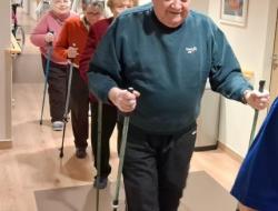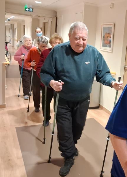 Le nouvel atelier de marche nordique rencontre un franc succès auprès de nos aînés. C'est dans un premier temps dans les couloirs de la résidence, que les résidents se familiarisent avec l'équipement et la gestuelle. Ce curieux défilé, attire d'autres résidents à se joindre au groupe qui ne cesse de s'agrandir.