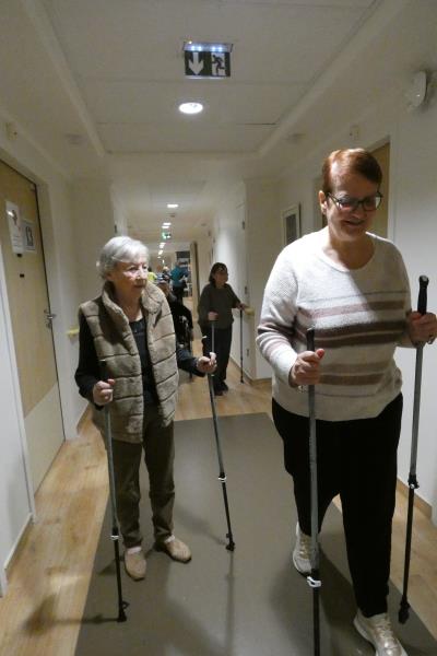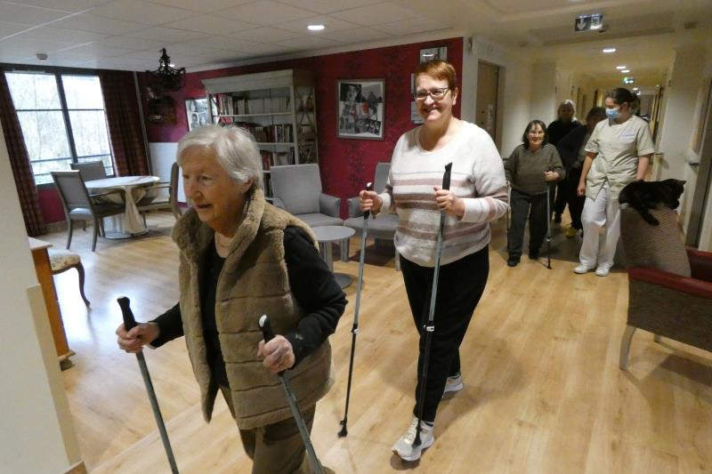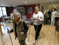 Les résidents du rez-de-chaussée haut se familiarisent à leur tour à la pratique de la marche nordique, en intérieur dans un premier temps, dans l'attente des beaux jours.