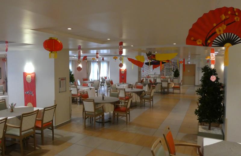 Pour marquer cet événement, la salle restaurant s’est parée de rouge et d’or, couleurs porte-bonheur en Chine. Lanternes, éventails et décorations traditionnelles ont plongé les résidents dans une ambiance chaleureuse et dépaysante.