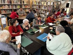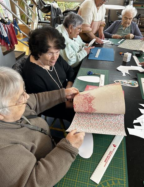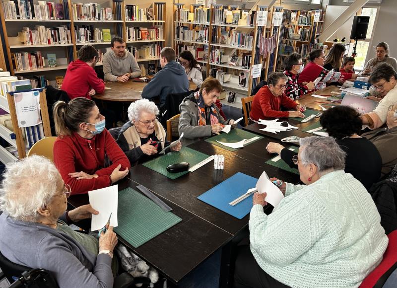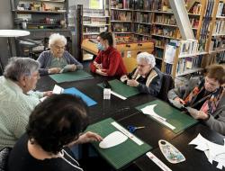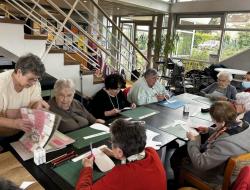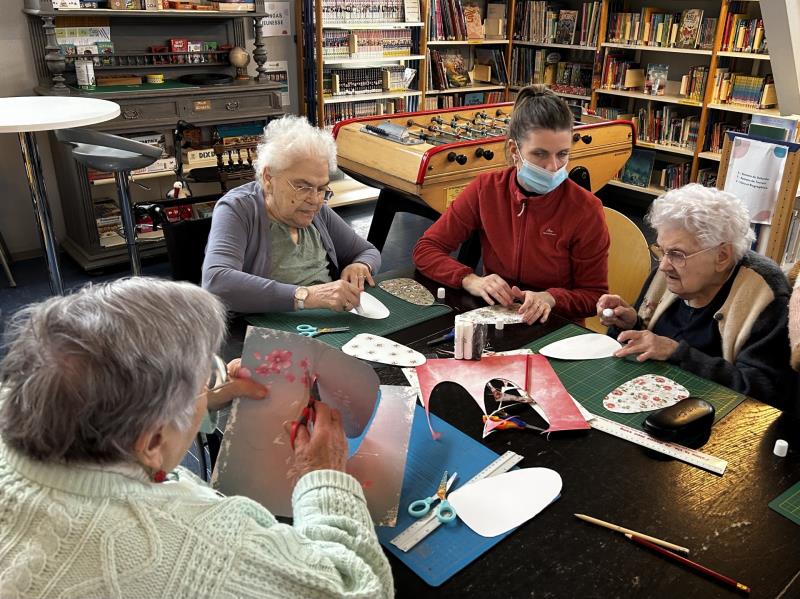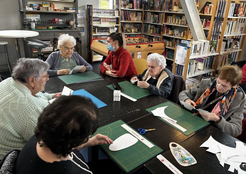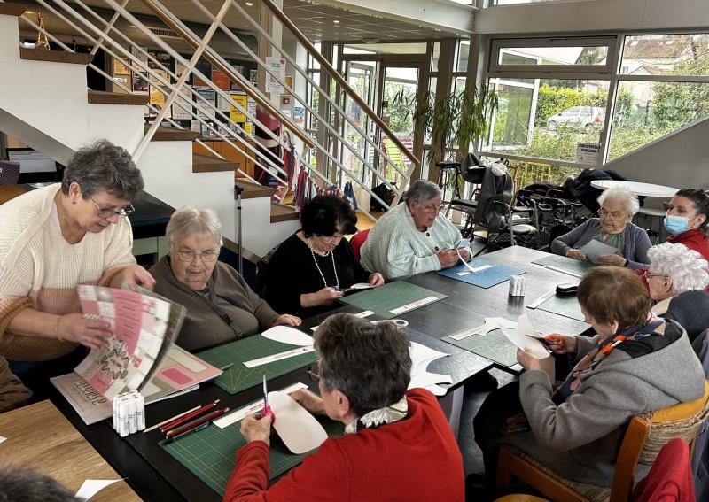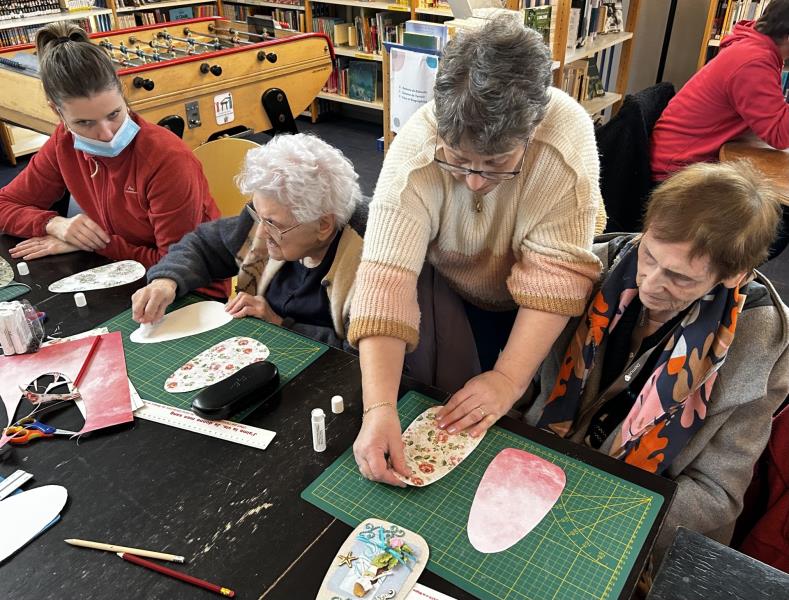 Martine, bénévole au Bidule, nous a accueillis pour un atelier scrapbooking. Les participants ont réalisé des supports de porte personnalisés afin qu'ils puissent passer un message (ex: "Je ne suis pas disponible pour le moment", "Bienvenue chez moi", "Merci de repasser un peu plus tard", "Je suis ravi de vous accueillir"...). Tous différents, chacun a créé son objet avec minutie et concentration.